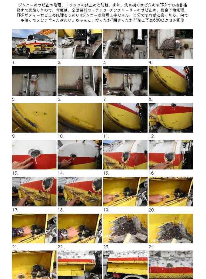 680ピクセル 1-560頁 www.blenny.jp--階層下 クルマのサビをどうする?水分あっても固まるサビ止め材料で、 コーティングして、自分でサビ穴はFRP板金修理って・・ 自動車のDIY補修の記録写真 タンクローリートラックの板金補修だから自分でしなければ 200枚の施工記録写真で2008年11月 ![]() http://www.blenny.jp/FRP_Rust_1508_20090124jimmy/web680p/Source/Thumb1.html ![]() http://www.blenny.jp/FRP_Rust_1508_20090124jimmy/web680p/Source/Thumb1.html ![]()